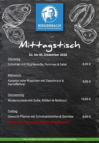 In unserem Ladengeschäft in Mittelkalbach haben wir Woche für Woche leckere Angebote für Sie. Bei uns erhalten Sie auch frische, warme Mittagsmenüs. Bitte das Essen immer bis 10 Uhr vorbestellen. da wir sonst nur eine bestimmte Anzahl an Menüs vorhalten können!